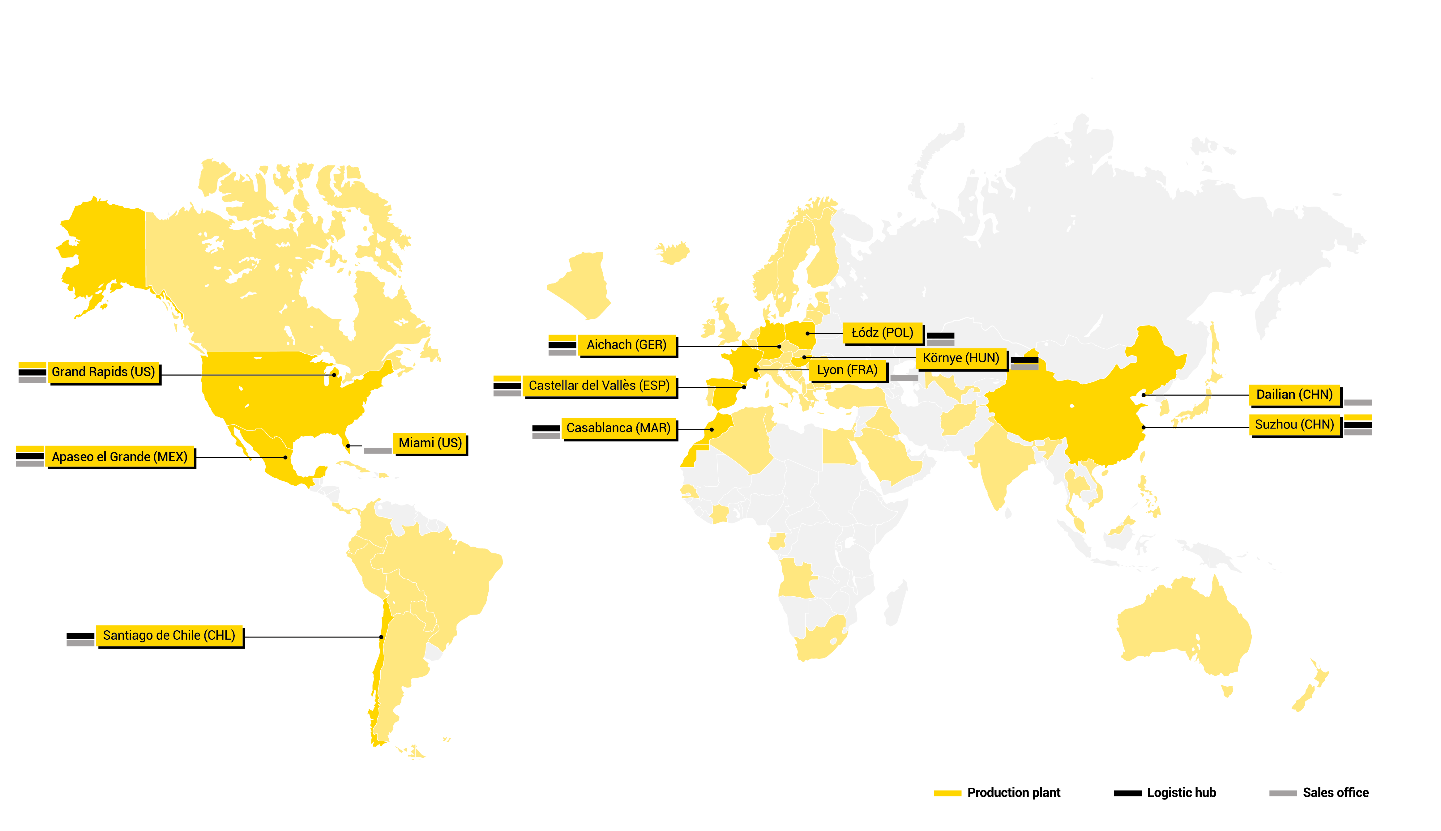 Imamo proizvodne pogone u Španjolskoj, Njemačkoj, Kini, Meksiku i Sjedinjenim Državama, kao i 10 logističkih centara na četiri kontinenta, što znači da možemo ostati blizu tvrtki s kojima radimo i nuditi brza, učinkovita rješenja za promjenjive zahtjeve.